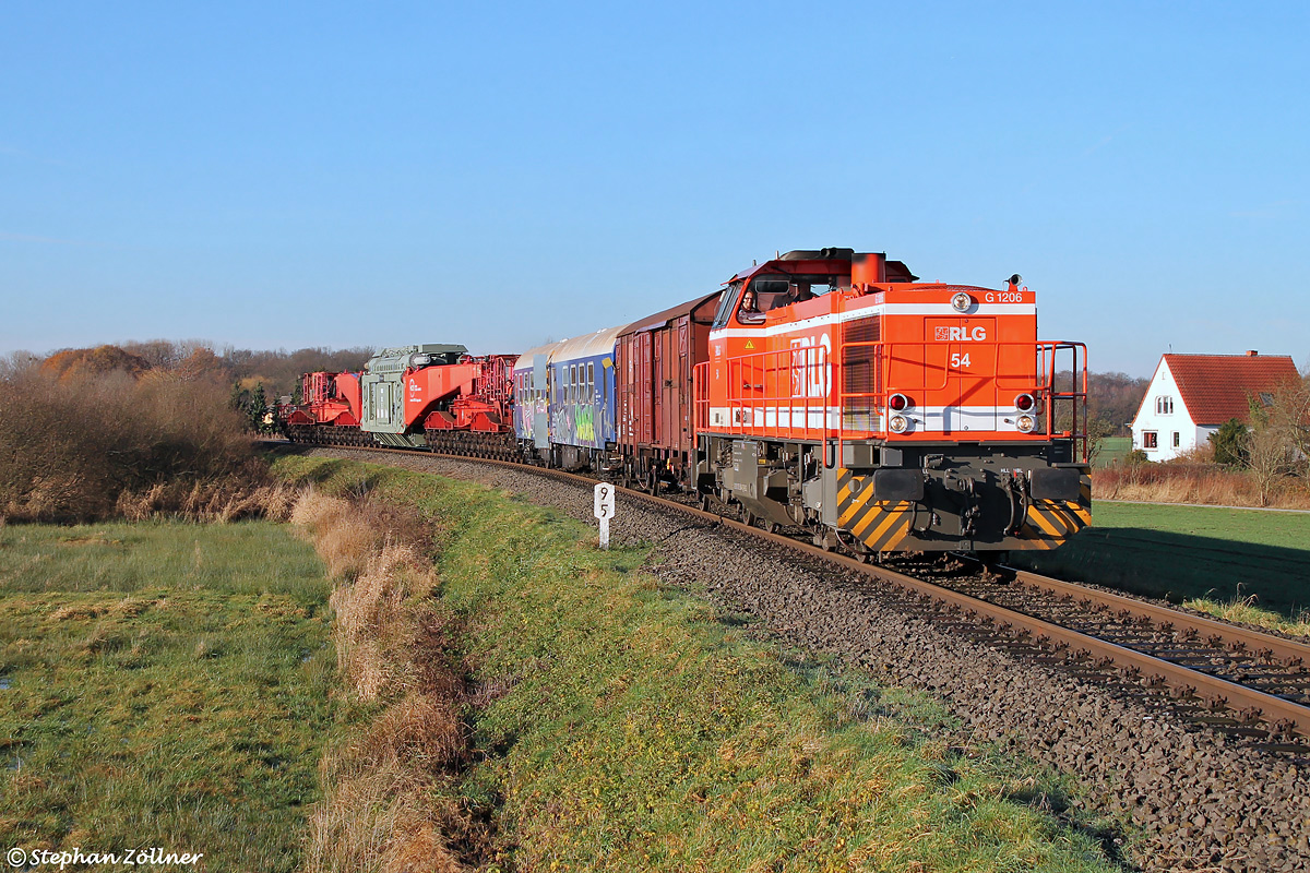 Am 08. Dezember 2015 konnte auf der Strecke Hamm – Lippborg einer der sehr seltenen Trafotransporte zum Kraftwerk Westfalen bei Tageslicht beobachtet werden. Bei Hamm-Haaren hat RLG 54 mit dem aus dem UW Dortmund-Kruckel stammenden 256 Tonnen-Brocken soeben die Brücke über den Datteln-Hamm-Kanal überquert und rollt nun die Rampe Richtung Schmehausen herunter, wo sie schon von gleich drei Fotografen erwartet wird.