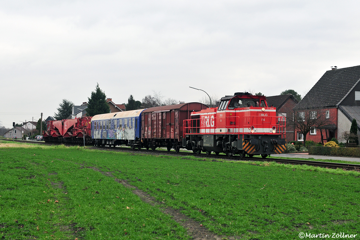 Mit dem kurzgekuppelten Tragschnabelwagen Uaai 839 ist RLG 54 am 18. Dezember 2015 auf dem Weg von Schmehausen zum Hammer Rangierbahnhof. Dort wird der Schwerlastwagen wieder an DB Cargo zur Weiterbeförderung zum nächsten Einsatzort übergeben. Bei Schmuddelwetter rollt die Fuhre an der Langen Reihe vorbei.