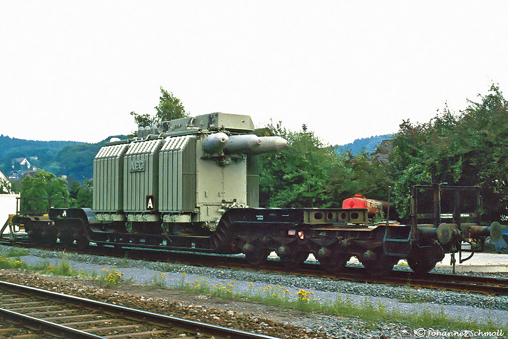 110 kV-Trafo-Anlieferung auf einem der beiden Uaais 779 (994 5 900) in Balve, 09.08.1988, Aufnahme: Johannes Schmoll