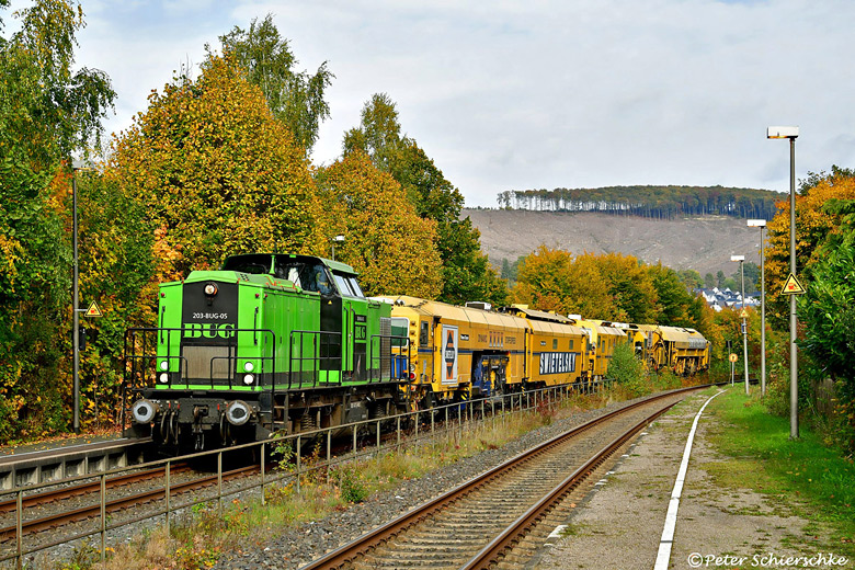 Blühende Landschaften zwischen den Gleisen im Jahr 2022 auch in Oeventrop. Da fügte sich der grüne Laubfrosch namens 203 BUG 05 der BUG Vermietungsgesellschaft mbH gut ins Bild ein. Die ehemalige DB AG 202 804 war am 13. Oktober für die Überführung diverser Stopf- und Planiermaschinen der Fa. Swietelsky von Brilon Wald nach Duisburg Hochfeld Süd eingesetzt. Peter Schierschke passte den Zug bei der Vorbeifahrt genau in den Aufnahmeabschnitt ein.