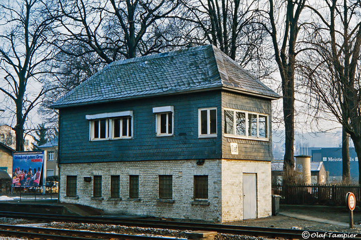 Das Fahrdienstleiterstellwerk "Oef" befand sich am Südende des Bahnsteigs 1, hier von Olaf Tampier Anfang 1986 als Detailaufnahme dokumentiert: