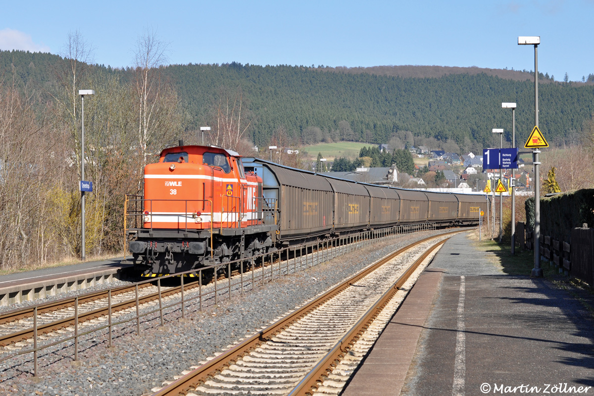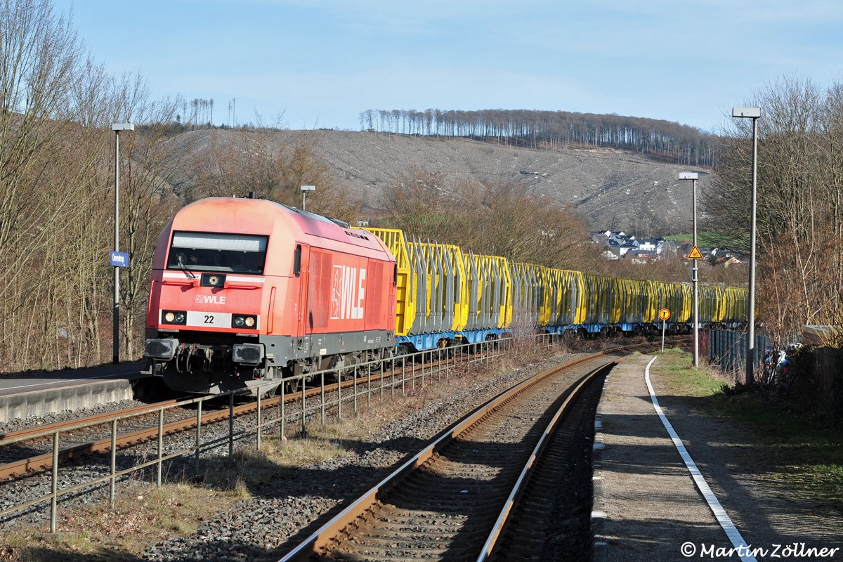 Fast auf den Tag genau 12 Jahre liegen zwischen diesen beiden Aufnahmen von der Oeventroper Osteinfahrt. Während am 19. März 2011 links die Deutzlok WLE 38 mit dem seinerzeit noch regelmäßig samstags verkehrenden Spanplattenzug von Egger nach Dänemark um die Kurve in den Haltepunkt rollt, ist rechts ein ebenfalls mit WLE-Lok traktionierter Gigawood-Leerholzzug auch auf dem Weg vom Eggerwerk nach Lippstadt zu sehen. Wegen des Schattenwurfs am frühen Morgen des 17. März 2023 entstand das Bild zwanzig Meter weiter Richtung Bahnsteigende. Frachtführer des Rohholztransportes war HLG Bebra. Eurorunner 22 benötigt hier talwärts kaum Motorleistung.