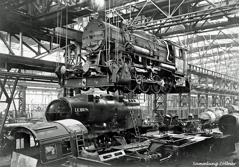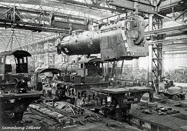 Um 1924 entstand diese Aufnahme in der Lokrichthalle, dem sogenannten Wanderschiff II, welche das Aufsetzen des Lokkessels auf das Fahrgestell einer G 8.2 mit dem Brückenkran eindrucksvoll zeigt.
