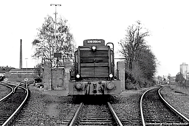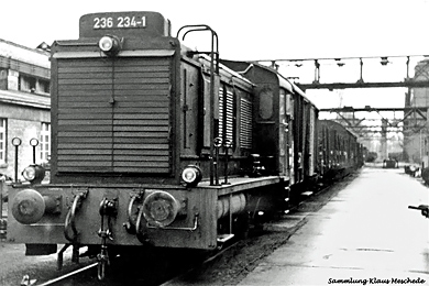 Später kamen hier die ex Wehrmachtslokomotiven der Baureihe V 36 vom Bw Wuppertal-Steinbeck zum Einsatz, wobei die Maschinen 236 204 und 236 234 bildlich belegt sind (um 1970).