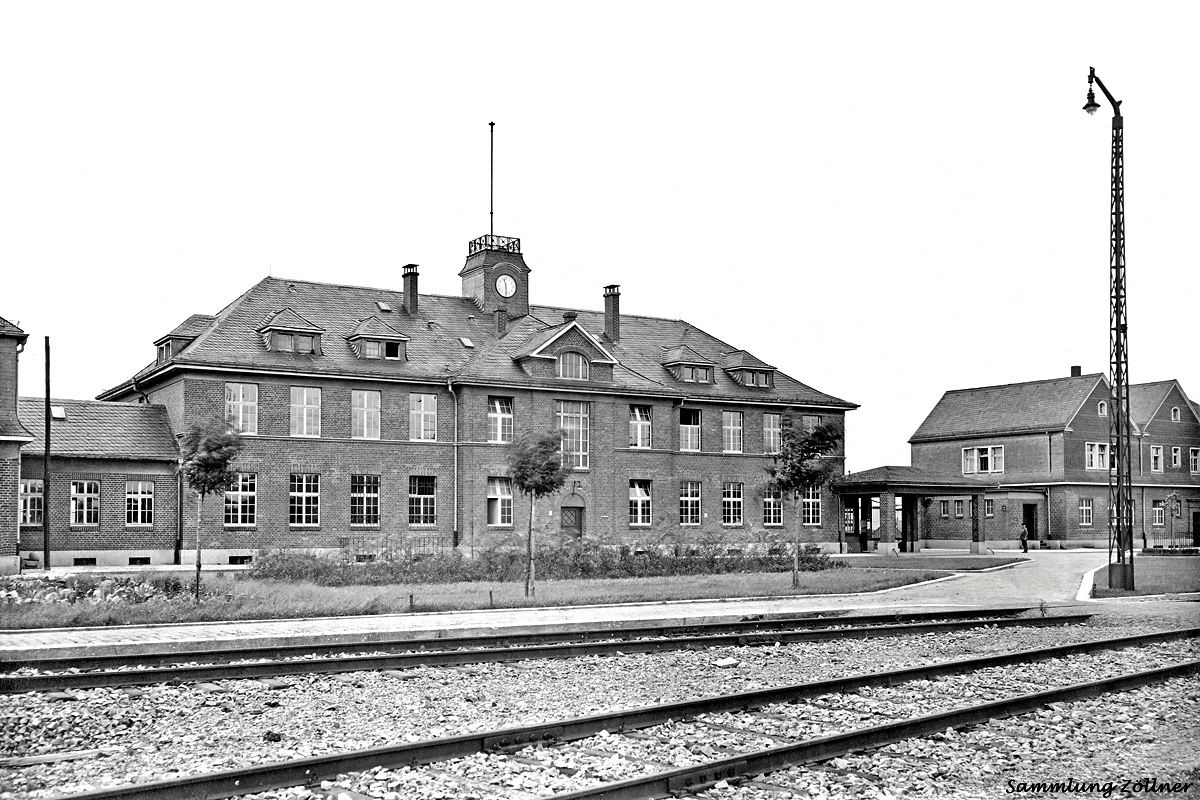 Den Eingangsbereich mit dem Pförtnerhaus von der Straßenseite aus zeigt dieses Bild aus dem Jahr 1957. Am Verwaltungsgebäude hat sich mittlerweile massiv der Efeubewuchs ausgedehnt.