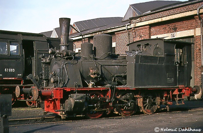 Die erste Werklok überhaupt war eine preußische Tenderlok der Gattung T 9.1. Als Lok 2 wurde die von Humbolt unter der Fabriknummer 32 im Jahr 1899 gebaute, ehemalige 6221 Elberfeld bzw. ex 1744 bezeichnet und bereits 1924 dem Aw zugeteilt. Ihre offizielle Ausmusterung erfolgte am 06. März 1968. Aufnahme der wohl schon länger abgestellten Maschine (links) von Helmut Dahlhaus am 12.10.1967.
