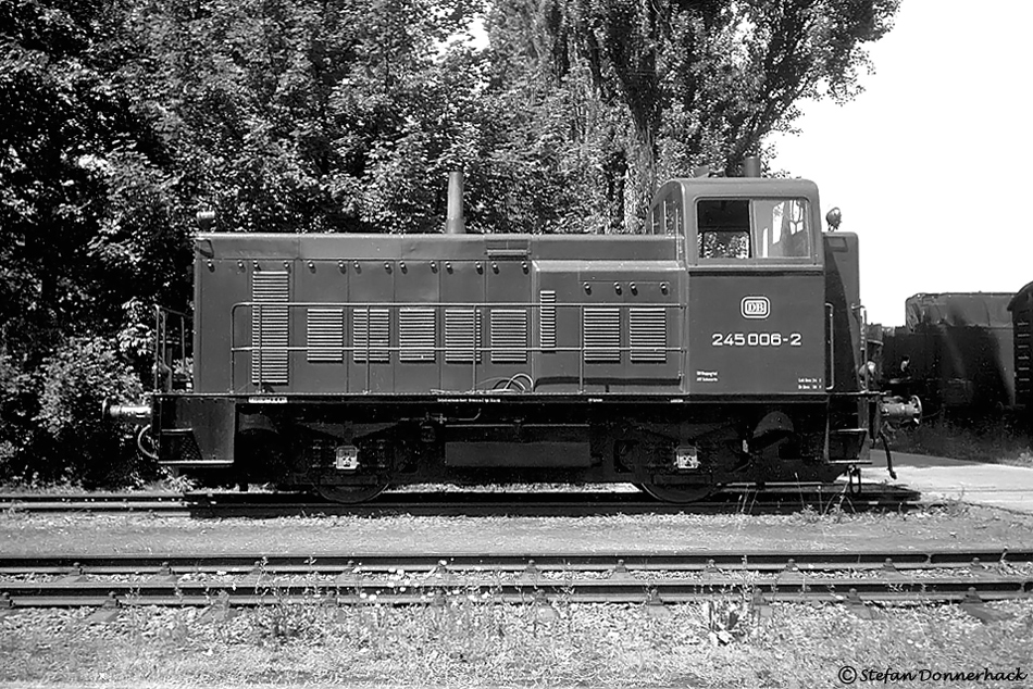 Neben den beiden kleinen Dampfloks war im AW Schwerte auch die V 45 006 im Rangierdienst tätig, hier im August 1968 schon zu 245 006 umgenummert von Stefan Donnerhack bei einer Rangierpause aufgenommen.
