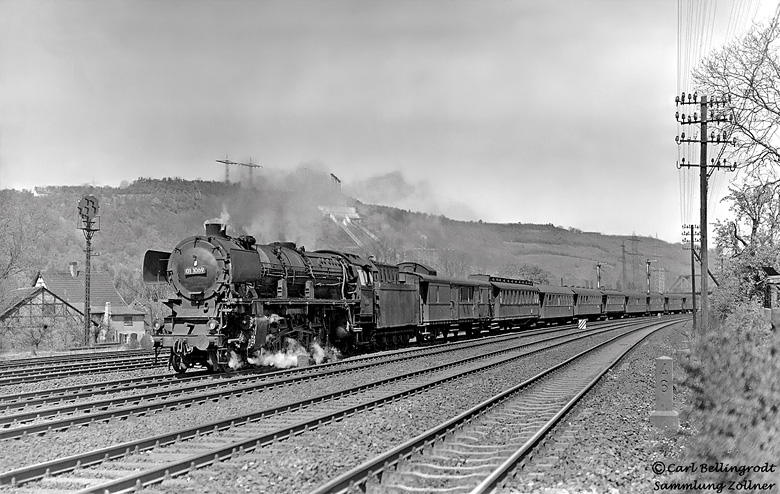 Der Altmeister Carl Bellingrodt postierte sich 1957 mit seiner Plattenkamera in Hagen-Bathey gegenüber vom Pumpspeicherkraftwerk "Koepchenwerk" und lichtete 01 180 mit dem vorbeifahrenden D 31 nach Braunschweig und gut gefülltem Rangierbahnhof Hengstey ab.