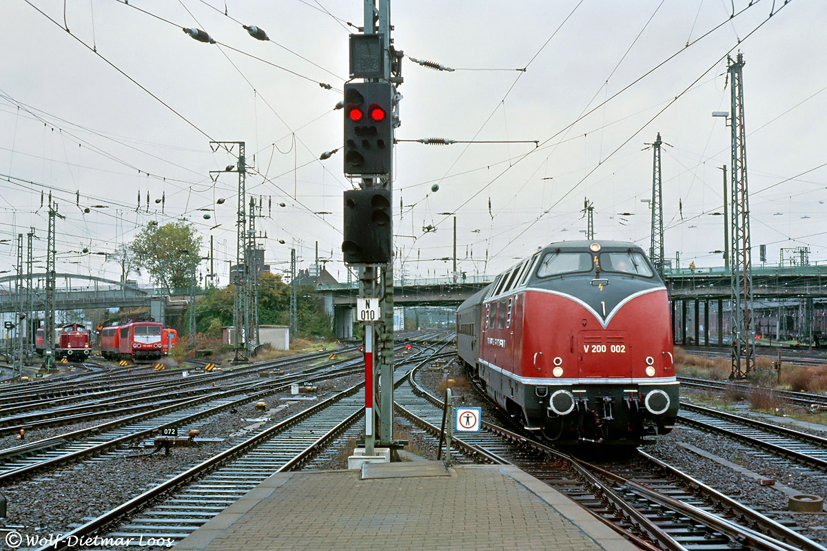 Km 141,740 Bahnhof Hagen Hbf [EHG]Nach einer erneuten Hauptuntersuchung am 19.02.1998 im Aw Nürnberg erfreute sich die Museumslok V 200 002 anschließend bester Gesundheit und wurde nun wieder mit diversen Sonderzügen auf die Strecke geschickt. Am verregneten 27. Oktober 2000 war die Maschine unter anderem auch im Hagener Hbf zu sehen. Wolf-Dietmar Loos nahm sie um kurz nach Drei bei der Einfahrt nach Gleis 8 zusammen mit der gerade aus dem Betriebshof ausrückenden und ebenfalls in altrot gehaltenen 212 007 auf, wie dieses Bild zeigt. Nachdem die Lok beim verheerenden Großbrand vom 17.10.2005 in Nürnberg Gostenhof vollkommen zerstört wurde, erfolgte im Juni 2006 die Zerlegung der Überreste dort vor Ort.