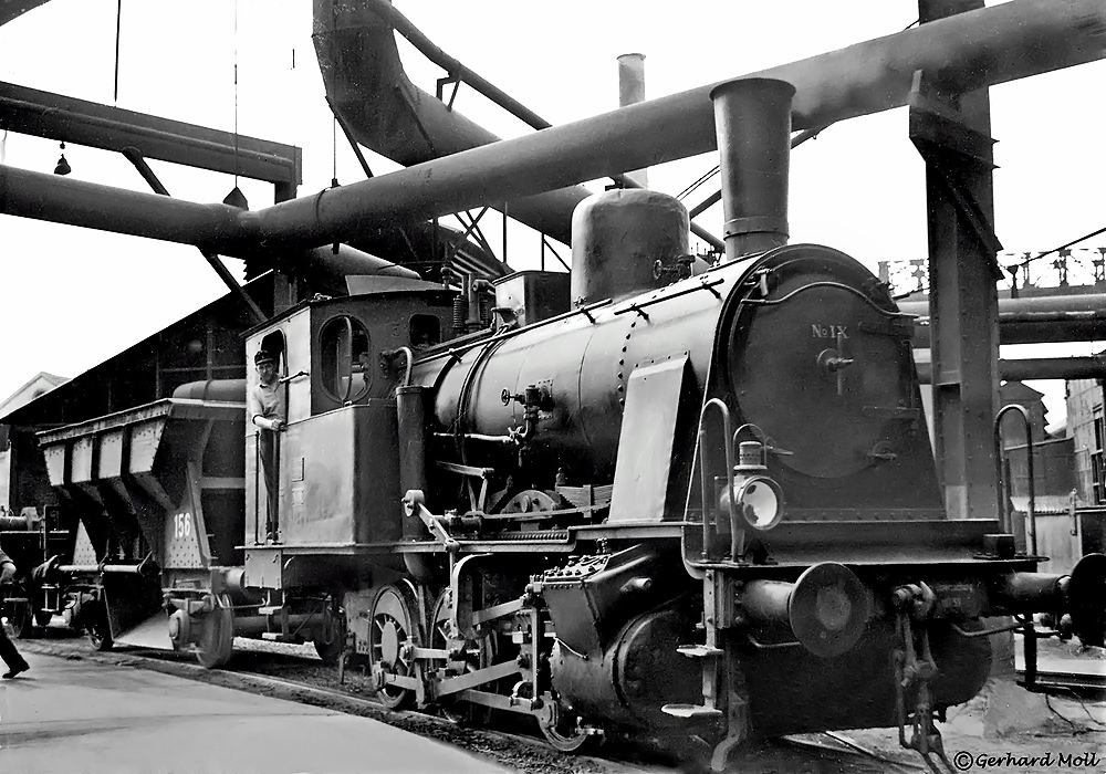 Km 138,069 Bahnhof Hagen-Haspe [EHGP]Die Hasper Hütte verfügte innerbetrieblich über ein großes Werkbahnnetz, sowohl in Normalspur 1435 mm als auch in Schmalspur mit 900 mm Spurweite. Stellvertretend eine Aufnahme aus dem Jahr 1960 mit Lok IX, (Jung 1851 ⁄ 1912, Typ 40 PS-34,1 t, Ct, 1435 mm, 18.10.1912 geliefert an Eisen- und Stahlwerk Haspe "IX" ⁄ » Klöckner Bergbau AG, Hagen-Haspe "IX" (06.1972 a vh) rangierend im Werksgelände.