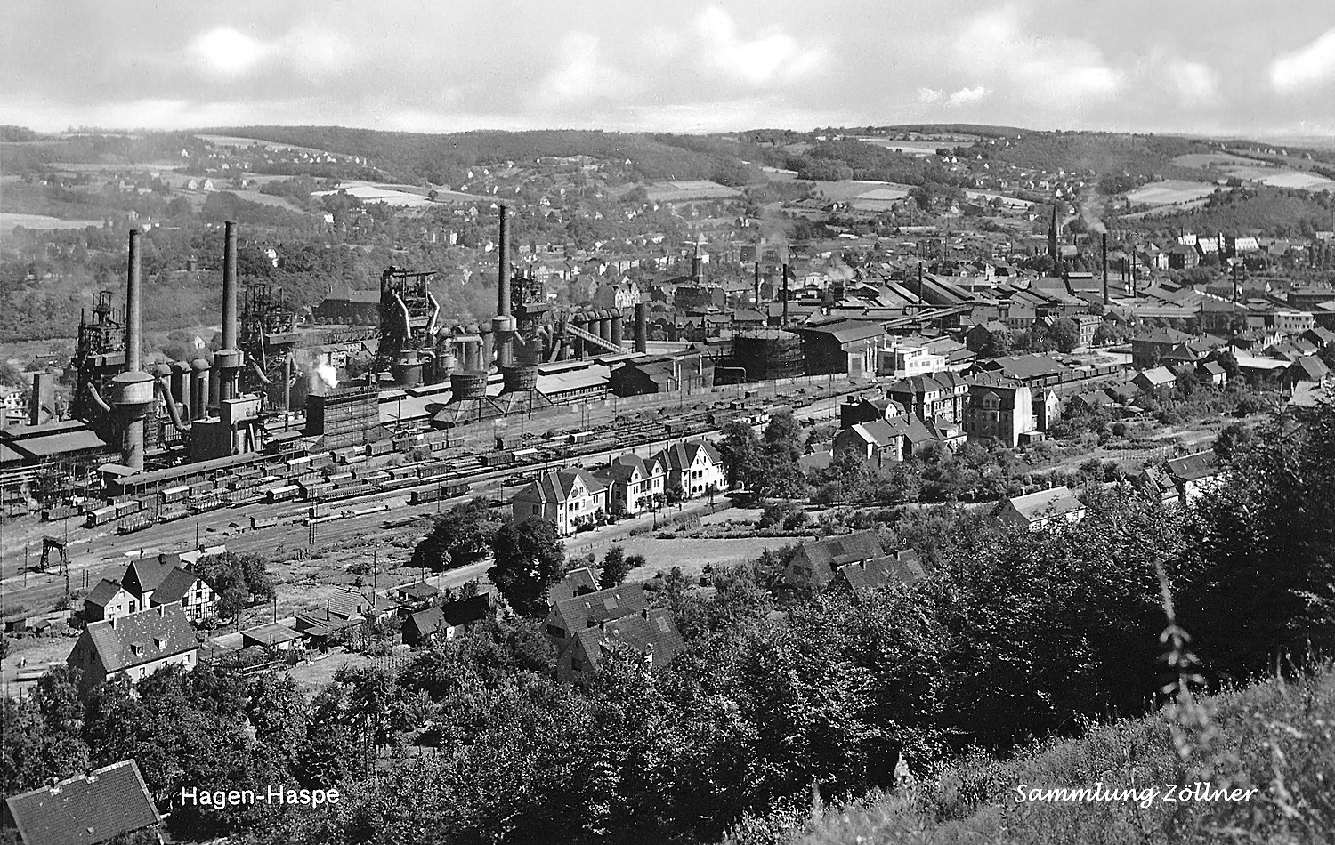 Die Klöckner Hüttenwerke Haspe AG, kurz Hasper Hütte genannt prägten 135 Jahre lang mit ihren riesigen Anlagen und rund 4 Kilometer größter Ausdehnung das Bild im Stadtteil Haspe. Neben den 1906 bis 1914 in Betrieb genommenen vier Hochöfen zur Roheisenerzeugung, welche direkt neben dem Bahnhof Haspe an der Strecke 2550 lagen (Bahnanschluss seit 1849, siehe folgendes Bild aus dem Jahr 1927), waren sowohl ein Thomasstahl- als auch ein Siemens-Martinstahlwerk mit fünf Öfen vorhanden. Walzstraßen für hochwertige SM-Bleche sowie für Profileisen und Draht sind ebenfalls zu nennen. Die endgültige Stilllegung der letzten Betriebe erfolgte am 22.12.1982.