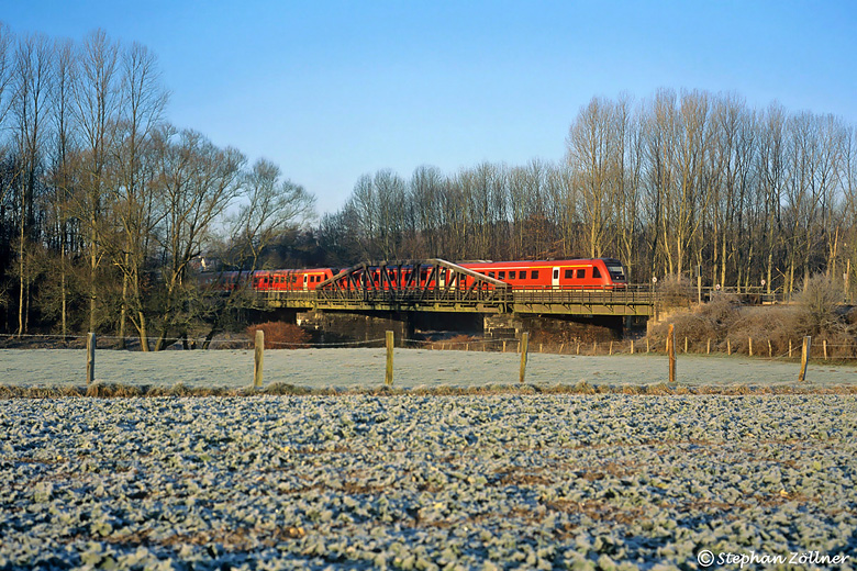 Km 179,9 Wickede, RuhrbrückeFrostig kalt war es am Morgen des 09. Januar 2006 an der Ruhrbrücke in Wickede. Wegen des traumhaften Winterwetters wurden ein paar Aufnahmen des damaligen Regelverkehrs im Bereich Echthausen angefertigt. Als erstes wanderten 612 040 samt Bruder 045 als RE 3907 auf dem Weg nach Kassel auf den Mittelformatdiafilm.
