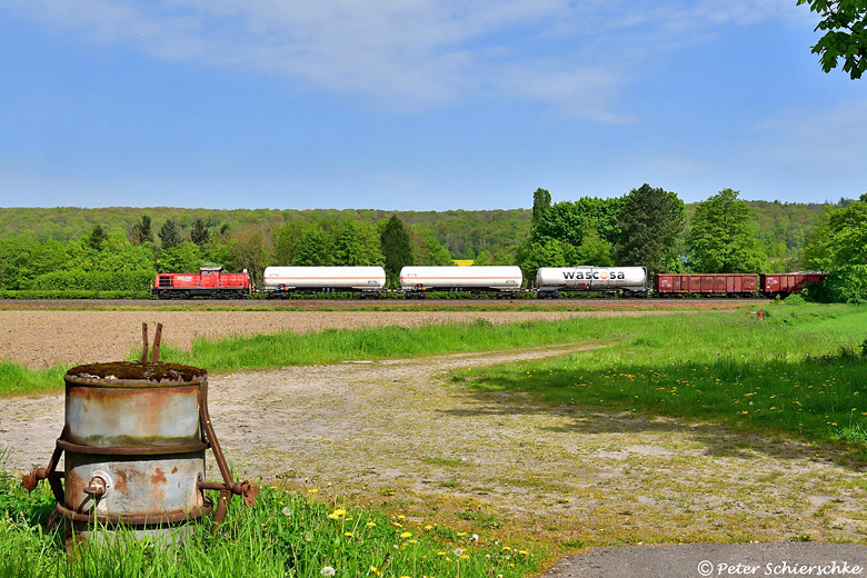 Km 180,1 Echthausen, AbwasserpumpanlageIn den Frühstunden des 16. April 2020 konnte DB Cargo die Eingangswagen für die Ruhr-Lippe in Neheim-Hüsten nicht zustellen. Folglich machte sich RLG 57 am Vormittag selbst auf den Weg nach Schwerte, um den aus einem Gas- und vielen Coilwagen bestehenden Zug abzuholen, damit diese noch am gleichen Tag den Kunden zugestellt werden konnten. Vom Rande des Rapsfeldes bei Echthausen konnte der Zug bildlich neben einem aus früheren Zeiten übrig gebliebenen Telegrafenmastenstumpf abgelichtet werden.