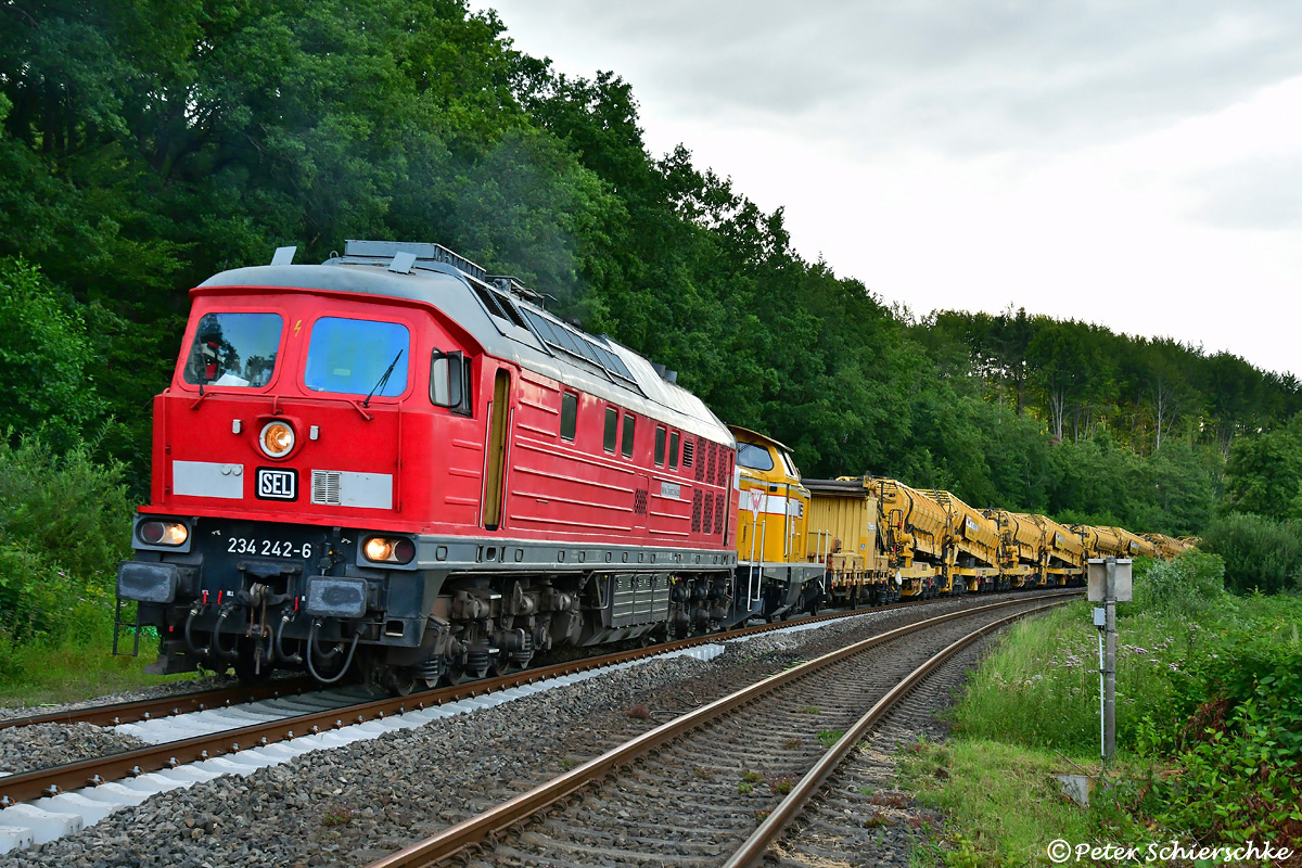 Auf der Gleisbaustelle zwischen Wickede und Vosswinkel Anfang August 2020 hatten 234 242 der Fa. SEL und Wiebe Lok Nr. 4 (ex DB 212 107) einen gemeinsamen Auftritt vor dem Bettungsreinigungszug. Peter Schierschke passte die beiden Maschinen während der Arbeit am Feldweg-BÜ bei Vosswinkel am 03. August ab.
