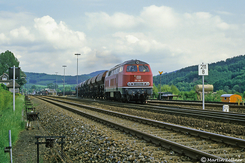 Mitte der achtziger Jahre wurde die Möglichkeit im Bahnhof Wennemen aus Gleis 3 gen Westen auf Hauptsignal ausfahren zu können noch mindestens zweimal pro Werktag genutzt und zwar für die von der Schmallenberger Strecke nach Neheim-Hüsten zurückkehrenden Übergaben. Am 30. Mai 1986 hatte 218 136 die Nachmittagsleistung aus Bergerhammer am Haken, als Martin vom BÜ Im Ruhrtal aus mit seiner Kamera zuschlug.