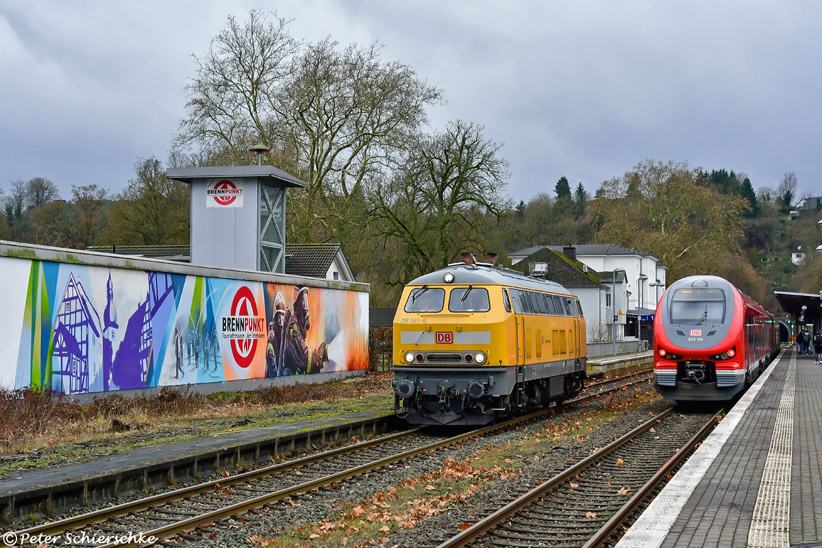Am Nachmittag des 10.12.2025 kehrte 218 261 von einer Schulungsfahrt durchs Ruhrtal nach Bestwig zurück. In Arnsberg konnte die Maschine dank saftiger Verspätung des vorausfahrenden RE 10763 mit der farblich neugestalteten Wand des Arnsberger Feuerwehrmuseums sowie dem Gegenzug 10760 nach Dortmund vom genau richtig stehenden Peter Schierschke aufgenommen werden.