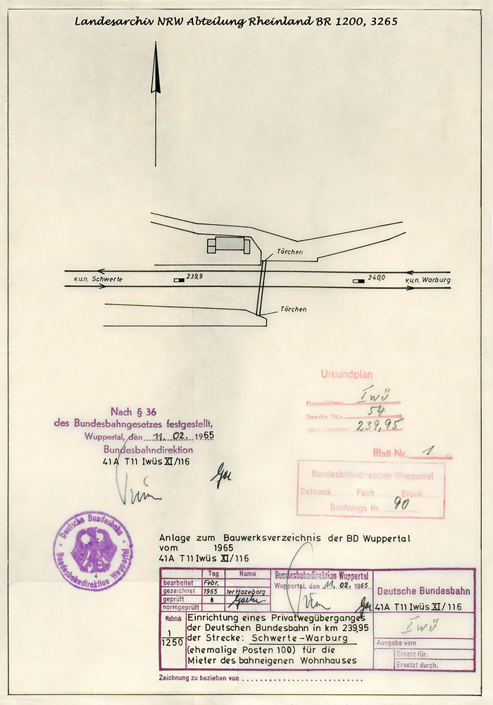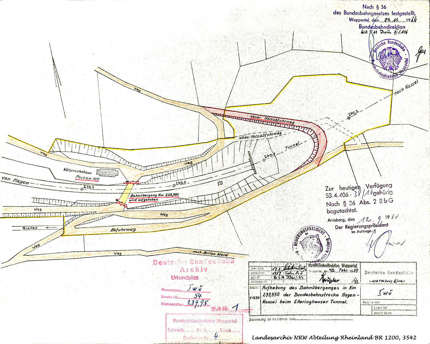 Posten 100, Elleringhausen BÜ im Km 239,950, Lagepläne Außerbetriebnahme: 1964 Status: BÜ später ganz aufgehoben Ersetzt 1965 durch Privatfußgängerüberweg |