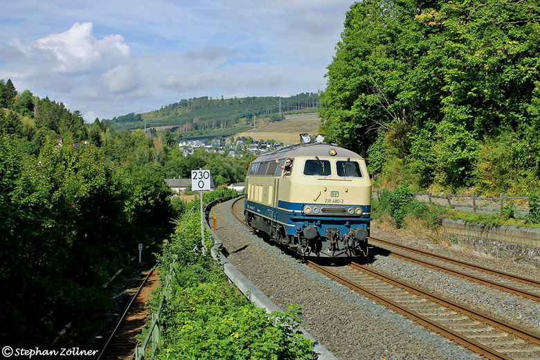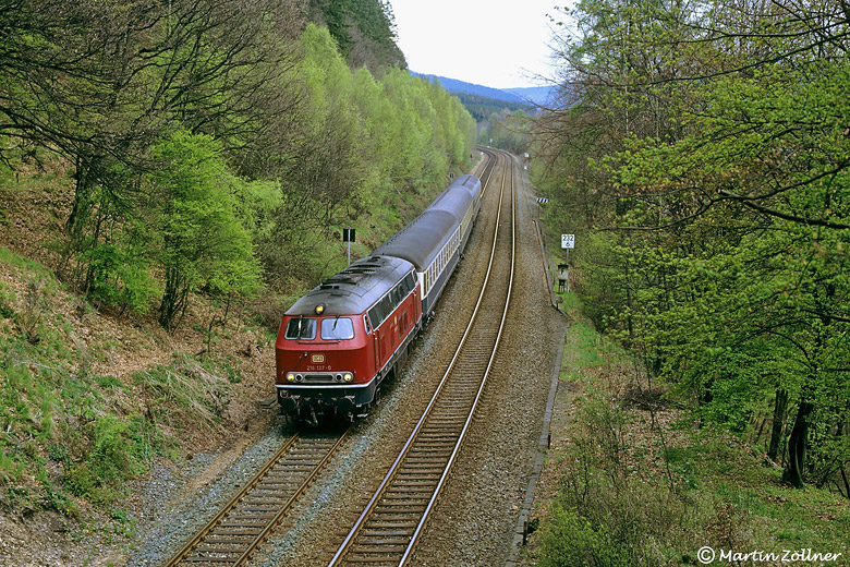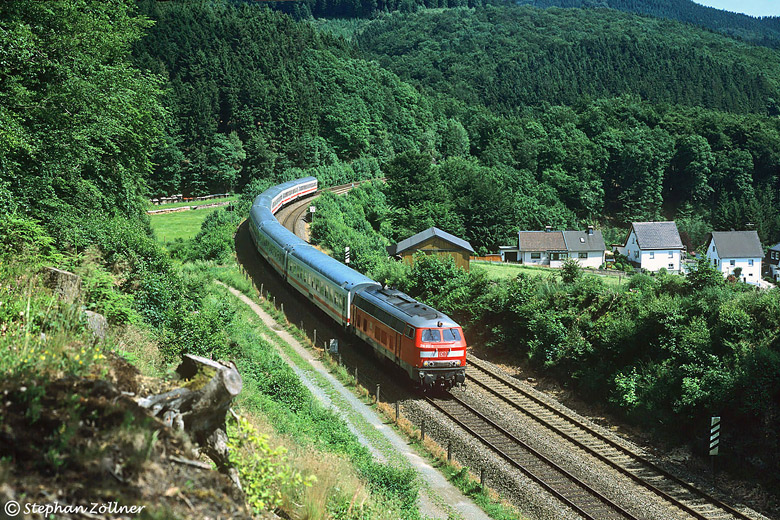Im Jahr 2003 fuhr der Wochenendsaisonzug nach ⁄ von Willingen noch als D-Zug mit Wagenmaterial des Fernverkehrs und 218 Bespannung. Aus der unteren Flanke des 669 Meter hohen Borberges an der Schmittmecke entstand am Sonntag, den 03. Juni die Aufnahme des D 2640 nach Düsseldorf Hbf mit Zuglok 218 012. Rechts unten eine der seltenen Vorsignalbaken mit vier Strichen (ungenügende Sicht) für das Vorsignal der Brilon Walder Einfahrt am Berggleis.