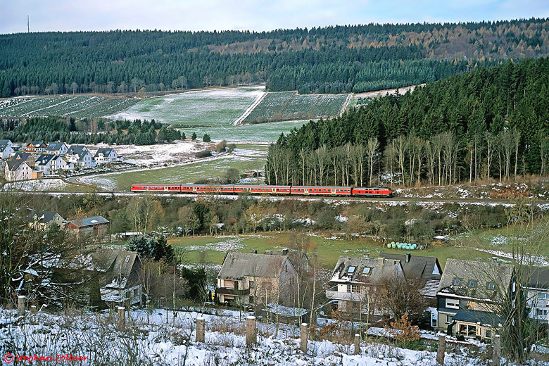 Km 234,7 Olsberg, KieneggeIm Jahr 2005 war der Blick von der Olsberger Kienegge in Richtung Rinkental mit der Oberen Ruhrtalbahn noch uneingeschränkt möglich, das Gelände noch nicht an privat verkauft und eingezäunt. Am Mittag des 02. Dezember konnte von dort oben in leicht angezuckerter Landschaft die 218 138 mit dem RE 29459 auf dem Weg von Hagen nach Willingen bildlich festgehalten werden.