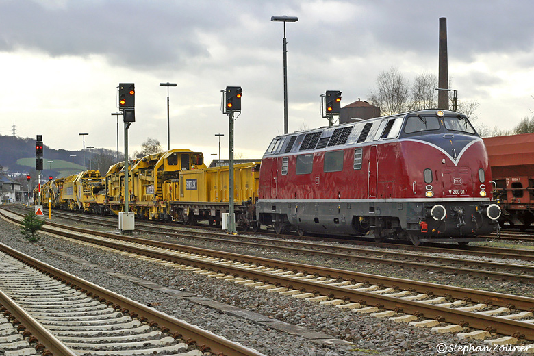Im Rahmen der großen Gleisumbauarbeiten zwischen Bestwig und Eversberg im März 2008 kam auch die V 200 017 der Fa. Reuschling im Sauerland zum Einsatz. Am 17.03. hatte sie den Swietelsky-Umbauzug am Haken, hier am Abend im Bestwiger Gbf fotografisch festgehalten.
