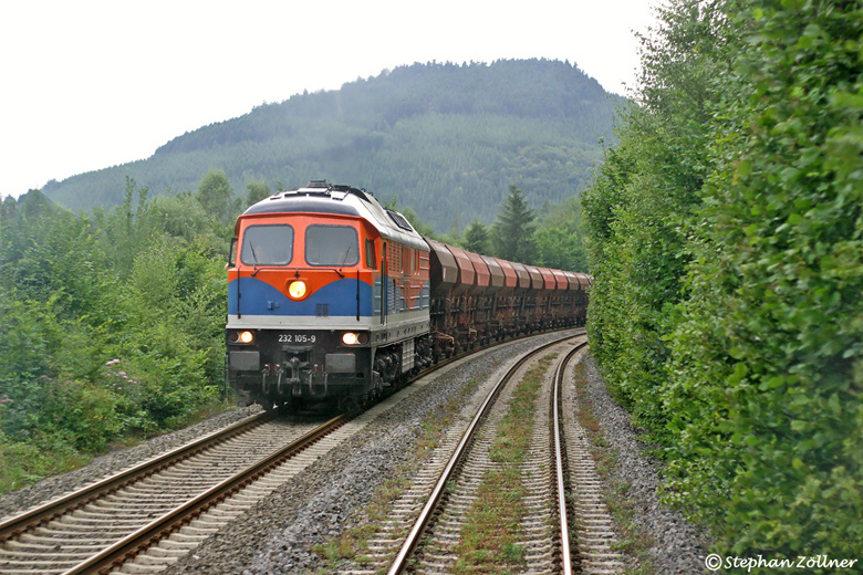 Im Jahr 2008 fuhr die ehemalige DB 232 105 unter der Flagge der Nordbayerischen Eisenbahngesellschaft in deren Hausfarben lackiert. Am 29. Juli bespannte sie einen Schotterzug von Bestwig zur Baustelle nach Brilon Wald mit dem es bei Olsberg zur Begegnung mit RE 93159 nach Hagen kam. Aus dessen Führerstand konnte dank Vormeldung dieses Beweisbild angefertigt werden.