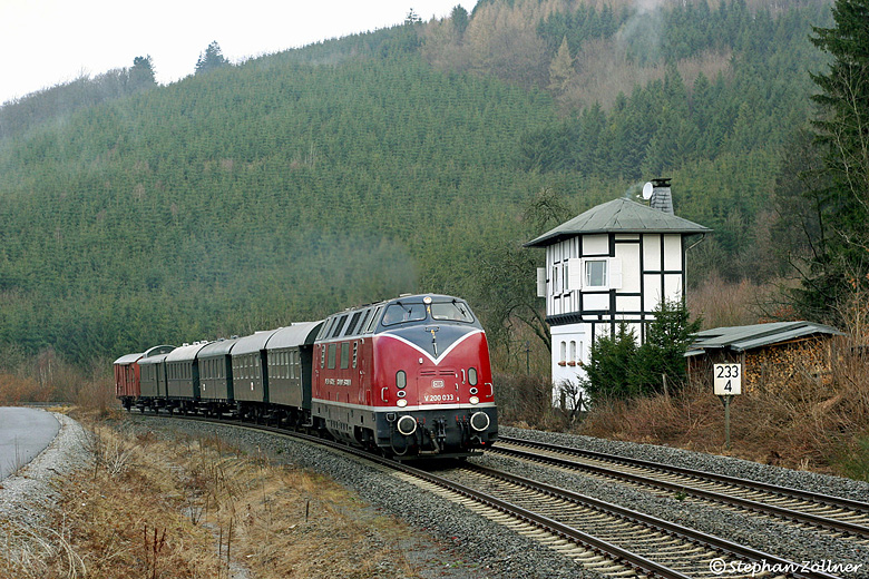 Zu einer Nostalgie-Winterfahrt ins Upland nach Willingen hatten die Hammer Eisenbahnfreunde mit der vereinseigenen V 200 033 für den 01. März 2009 eingeladen. Zu recht früher Stunde röhrt die Zweimotorige um kurz nach Neun am ehemaligen Stellwerk "Ow" in Olsberg vorbei. Während sich die letzten Nebelschwaden verzogen, schaffte es die Sonne leider nicht rechtzeitig durch die Wolkendecke und von Schnee war weit und breit auch keine Spur.