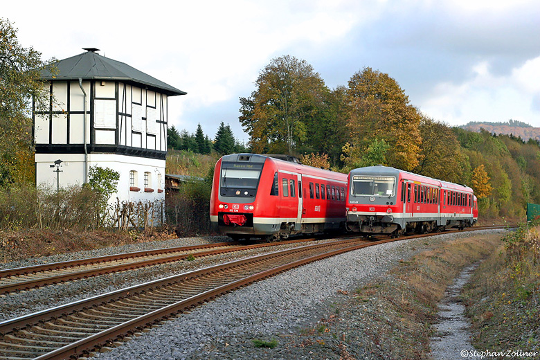 Angesichts des am Nachmittag des 25. Oktober 2009 aufreißenden Himmels ging es für ein paar Standartfahrzeuge raus an die Strecke. Im Bereich Olsberg kommt es stündlich zur Kreuzung zweier Züge des RE 17. Fährt der Zug talwärts am Hp pünktlich ab und bergauf gibt´s "plus Zwei", dann kann man am ehemaligen Stellwerk "Ow" beide auf einem Bild verewigen, wie hier RE 3922 und RE 29211. Leider verhinderte die obligatorische Fotowolke vom Dienst knapp das "Bild des Tages".