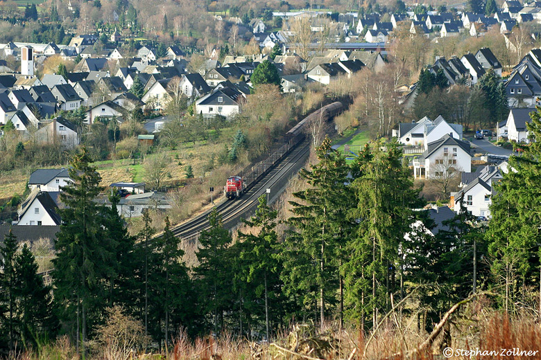 "Sauerland, Land der tausend Berge", so heißt ein Slogan der Tourismusbranche, den man sich auch für die Eisenbahnfotografie zu Nutze machen kann. Nach dem Orkan Kyrill im Januar 2007 ließen sich massenweise Motive von den kahlen Bergrücken aus umsetzen, wie hier am Olsberger Zwöllberg in der Helbeke mit Blick auf die Stadt samt Martin-Luther-Kirche (links). In einer kurzen Sonnenphase am Morgen des 26. November 2009 kam dort 294 774 mit dem Eggerzug des Weges und wurde genau an der Hektometertafel 234,6 fotografisch mit diesem Ergebnis abgebildet.