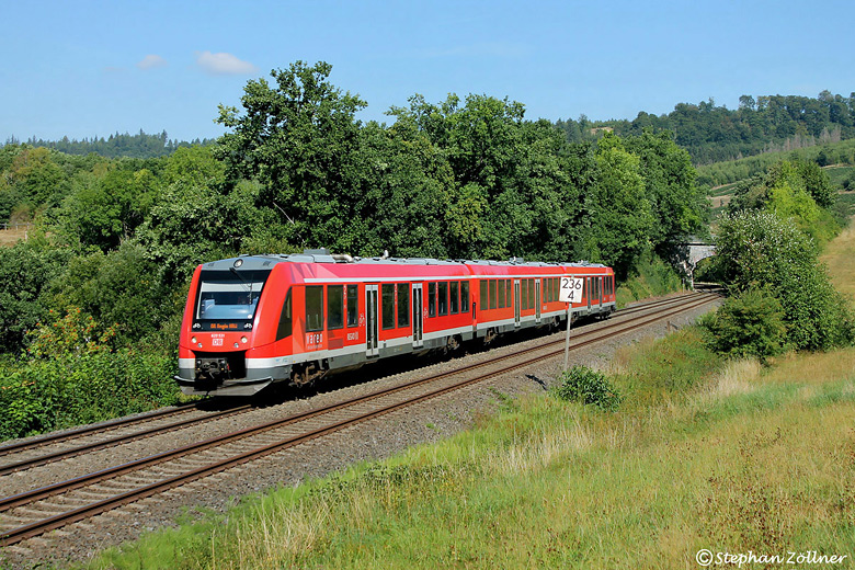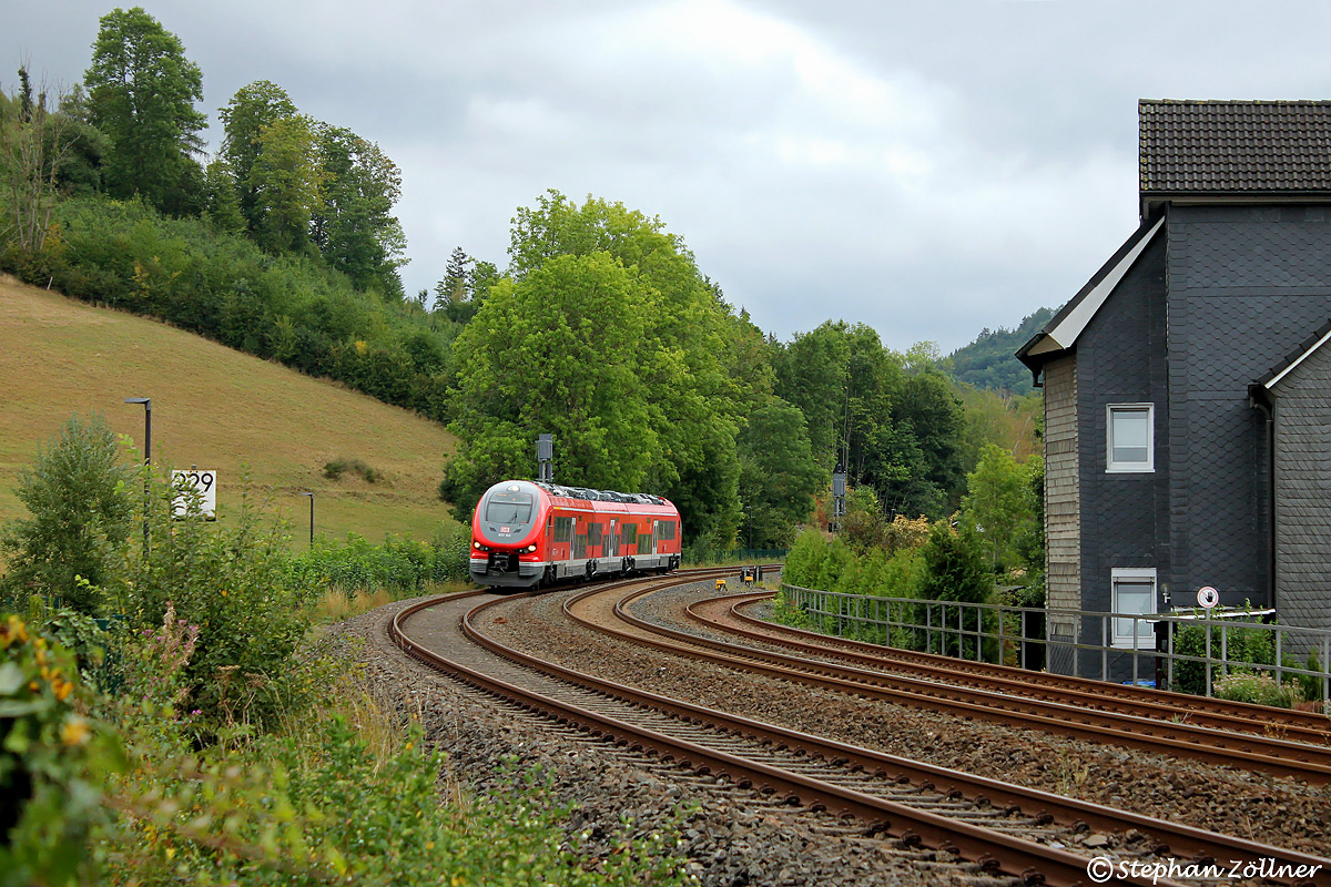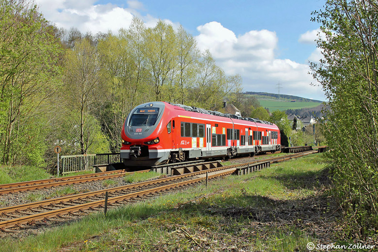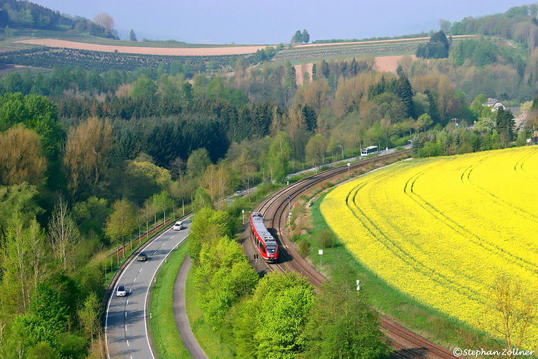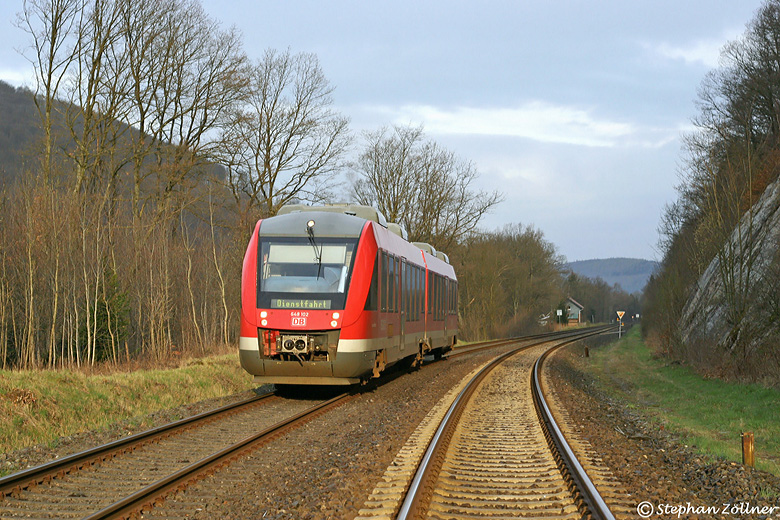 Im Jahresfahrplan 2012 wurde der Triebwagen der BR 648 nach der Fahrt des morgendlichen Schülerzuges RE 10956 von Winterberg ab Bestwig als Leerfahrt 73307 nach Brilon Wald für Folgeleistung RB 10483 gen Brilon Stadt überführt. Nach der Begegnung mit dem Gegenzug an der Roten Brücke in Olsberg am 12. April kam an der Kladmecke in Elleringhausen die Sonne hinter den Wolken hervor, was bei der nun "freien Bahn" zu einem spontanen Fotohalt in der dortigen, kleinen Kurve mit folgendem Ergebnis genutzt werden konnte.