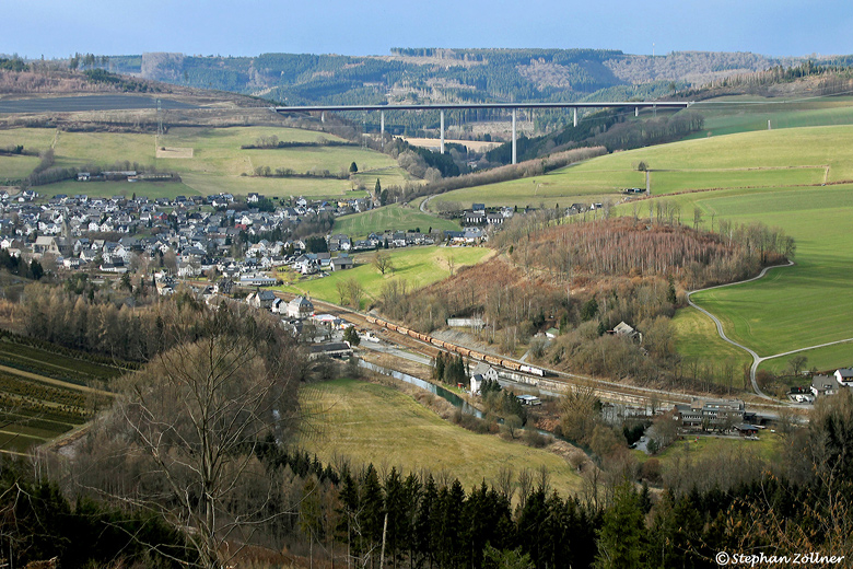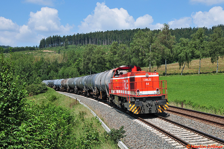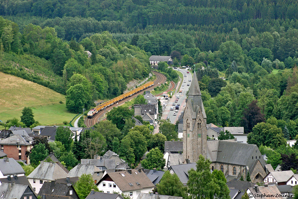 In den Sommerferien 2014 bescherte eine Gleisbaustelle mit Komplettsperrung zwischen Wickede und Neheim-Hüsten der Olsberger Rampe ein paar Umleitergüterzüge. Einer davon war der RLG-Kesselwagenzug nach Gladbeck über Warburg. Findet die Fahrt auf dem Regelweg in der Dunkelheit statt, konnte die Leerwagenleistung Richtung Ruhrgebiet am 31. Juli bei Tageslicht bildlich verewigt werden, hier an der Birkenallee am Olsberger Gierskopp aufgenommen.