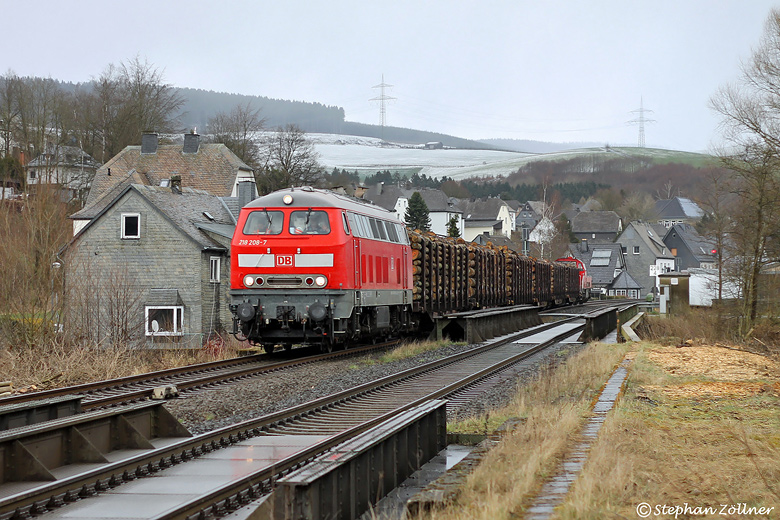 Exakt 24 Stunden und 45 Minuten später und diesmal bei leicht schlonzigem Himmel, stand der Fotograf erneut an derselben Fotostelle, als die PRESS 218 055 mit dem zweiten Teil eines Holzzuges von Hagen Gbf zum Eggerwerk die Steigung nach Brilon in Angriff nahm (Bild rechts).