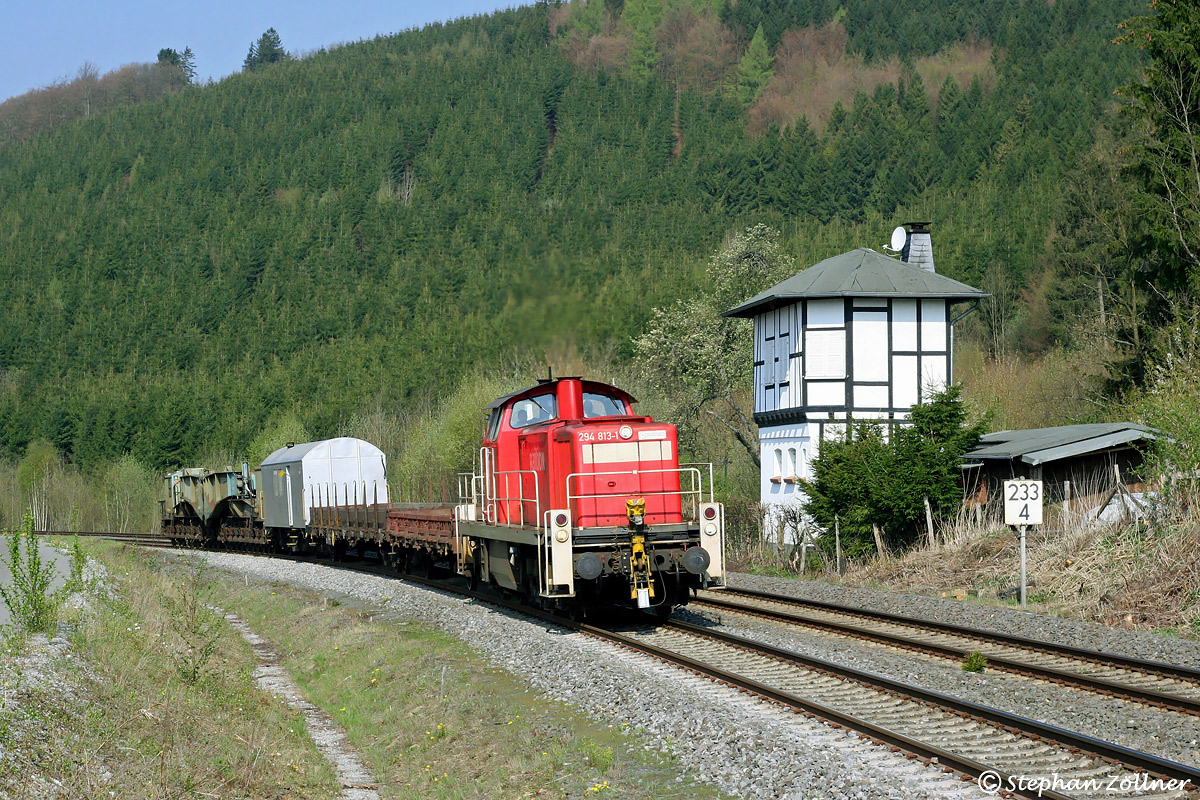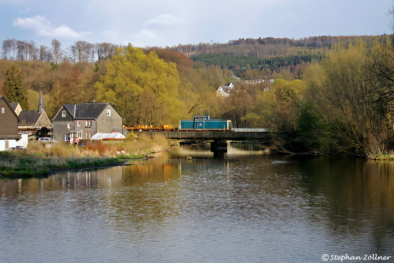 Bild rechts: Ein seltenes Ereignis ließ sich in der 17. Kalenderwoche 2010 im Oberen Ruhr- und Almetal beobachten und zwar die Abfuhr eines weiteren Großtransformators aus dem RWE-Umspannwerk in Büren. Für den 28. April war dabei die Zuführung eines leeren, RWE-eigenen Uaai-Wagens als Sonderleistung geplant. Rechtzeitig am Stellwerk Stellung bezogen, wanderte zuerst die planmäßige Eggerbedienung auf die Speicherkarte. Dank des an diesem Tag vergleichsweise leichten 54487 konnte keine zwanzig Minuten später die Sonderleistung noch in derselben Personenzugtaktlücke den Weg nach Brilon Wald antreten.