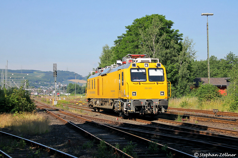 Nachdem die Schranken am Bahnübergang Kirchstraße in Nuttlar gegen Mittag des 08. Oktober 2025 für gleich drei Personenzüge knapp zehn Minuten geschlossen waren, zeigten die Ampelsignale nach dessen Öffnung wenig später erneut rotes Licht. Das deutete auf eine Sonderleistung hin, welche dann auch nach kurzer Zeitin Form des in Richtung Brilon Wald fahrenden Multifunktionsmesstriebwagens 702 203 vor der Kameralinse auftauchte. Heuer war einmal wieder die Messung der Gleislage fällig.