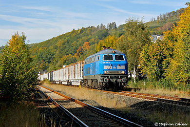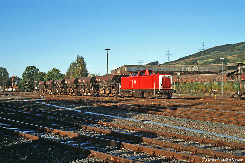 Traumhaftes Herbstwetter bestimmte den 12. Oktober 1992. An diesem Tag war die Hagener 211 079 für die Bedienung der Schotterverladung in Silbach zuständig. Mit sechs zweiachsigen Dienstgutwagen wartet die Maschine um kurz vor halb neun vor den Anlagen des ehemaligen Bahnbetriebswerkes auf die Abfahrt ins Negertal, als erfreut die Verschlüsse der beiden Kameras ausgelöst werden.