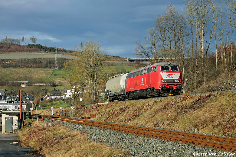 Die Meldung "Pidder Lüng" auf dem Weg ins Obere Ruhrtal am Mittag des 20. Dezember 2022 ließ die Nuttlarer Alarmrotte zügig zum Dümel an die Streckentrennung ausrücken. Gegen zwanzig vor Eins hatte die hier noch vorhandene, kleine Wolkenlücke mit den beiden Fotografen ein Einsehen und öffnete für die Strahlen der tiefstehenden Sonne kurzfristig den Himmel. Auf der Fahrt zum Firmensitz nach Gotha rollte die RP 218 402 dann passend mit ihrem einen Kesselwagen vor die Linsen der Kameras. Drei Minuten nach der Durchfahrt war für diesen Tag dann endgültig "Licht aus".