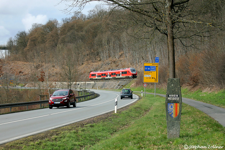 Sie verlassen den Mescheder Sektor, in diesem Fall 633 107 als RE 10711 nach Warburg am Sonntagmittag des 19. März 2023. Werktags lässt sich dieses Bild wegen dem enormen Lkw-Verkehr auf der Bundesstraße 7 wohl kaum realisieren, wobei hier die beiden Pkw genau im "passenden Bereich" auftauchten.