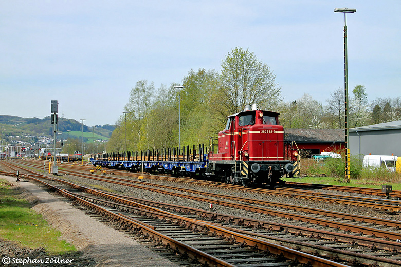 Km 227,930 Bahnhof Bestwig Gbf [EBWG]Am ersten Tag (04. Mai 2023) der vorerst vierteljährigen Streckensperrung zwischen Bestwig und Brilon Wald zwecks Sanierung des Elleringhauser Tunnels wurden die neuen Schienen für das eine verbleibende Gleis in der Tunnelröhre geliefert und vor Ort abgezogen. Az-Lok für diese Aufgabe war die altrote 260 588 des Fördervereins Bergische Bahnen Wupperschiene, die bei der Ausfahrt mit den Samms-Wagen aus dem Bestwiger Gbf auf den Chip gebrannt werden konnte.