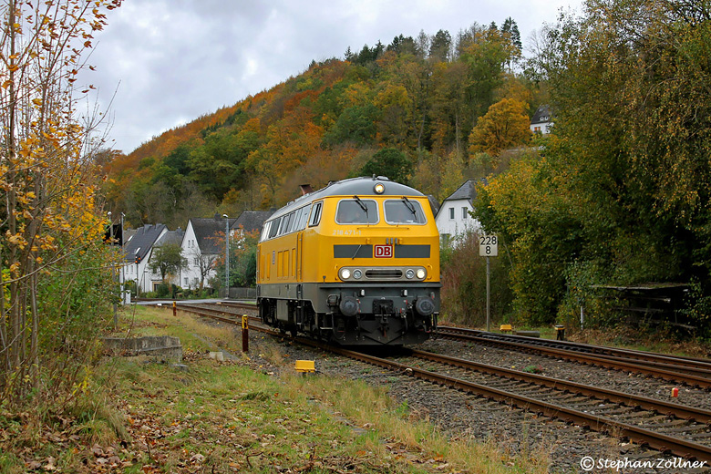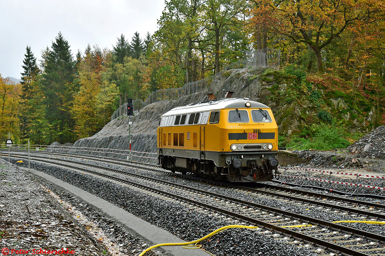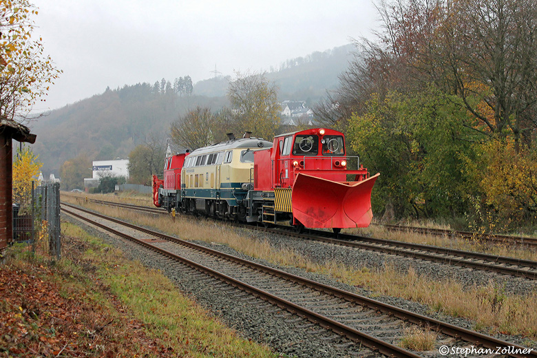 Einen Tag vor dessen Ende, am 02. November, fanden dann mit der am Abend des 26. Oktober in Bestwig eingetroffenen Winterlok, aka 218 471, diverse Probe- und Abnahmefahrten für das Eisenbahnbundesamt auf diesem Abschnitt statt. Bild der ersten Tour nach Brilon über das Regelgleis an der zwischenzeitlich komplett freigeschnittenen Nuttlarer Kirchstraße.