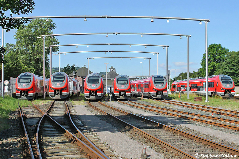 Km 227,200 Bahnhof Bestwig, Abstellgruppe Gl. 14-18Haialarm in Bestwig: Pesa-Link soweit das Auge reicht, wobei mehr als sechs Fahrzeuge auf einmal nebeneinander in der Abstellung auch nicht machbar und schon gar nicht bei Sonne fotografierbar sind. Am Vormittag des 15. Juli 2024 konnten wegen baubedingtem Minderbedarf durch Streckensperrung Fröndenberg – Bestwig und Scherfede – Warburg dort (v.l.n.r.) 632 113, 632 108, 633 111, 633 117, 633 113 und als einziger fahrend 633 116 (RE 10755 Bestwig---Winterberg) angetroffen werden.