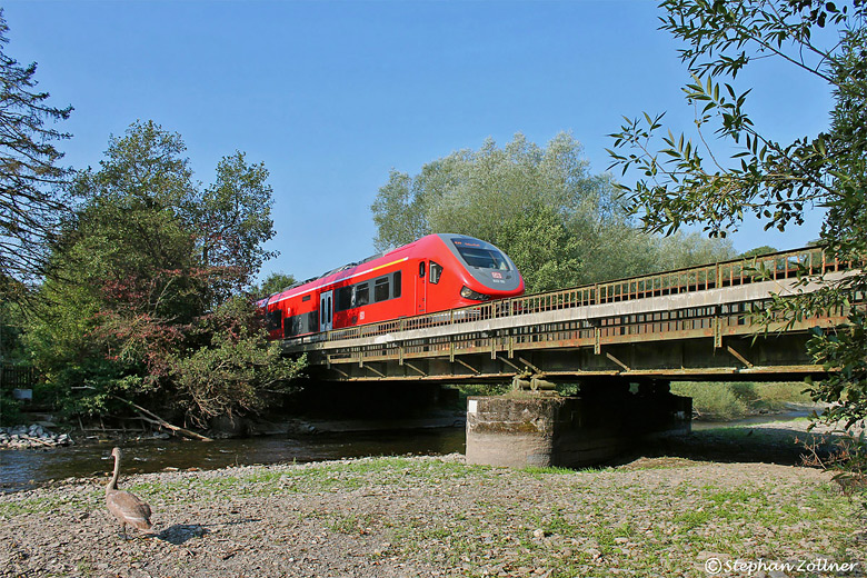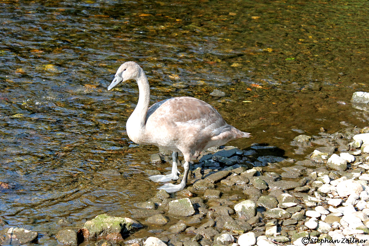 Das hatte während der Wartezeit auf einen passenden Zug dieser äußerst neugierige Bursche mitgekriegt und stattete dem Knipser über den Flusskies watschelnd erstmal einen Besuch ab. Da das ganze wohl doch nicht so spannend war, wandte sich das Tier leider genau, als 633 110 endlich im Sucher erschien, von der Linse ab. Wer den Schwan trotzdem gerne in voller Pracht sehen möchte klickt hier.