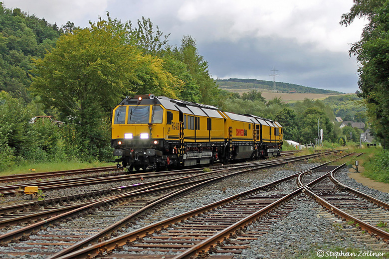 "Lotte", die LORAM Schienenschleifmaschine RG 48 der Fa. Schweerbau war am 05. September 2025 ab Bestwig im gesperrten Streckenabschnitt zwischen Nuttlar und Brilon Wald (Tunnelarbeiten am Elleringhauser Tunnel) im Einsatz. Kurz vor Mittag kam das Fahrzeug zwecks Wechsel des Arbeitsgleises kurz zum Umsetzen vom Berg herunter, hier bei der Einfahrt im Gbf mit eingeschalteten Rallyscheinwerfern auf den Chip gebrannt.