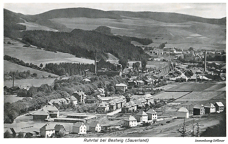 Km 227,000 Bahnhof Bestwig [EBWG]Um das Jahr 1935 blicken wir vom Ostenberg im Westen auf Bestwig mit seinen Bahnanlagen. Es fällt auf, dass der Rundschuppen im Bw zu dieser Zeit ein halbrundes Tonnendach trägt, welches später dann durch die eckige Form ersetzt worden ist.
