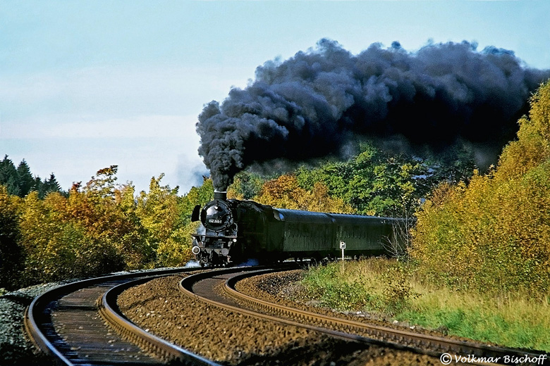Am 26. Oktober 1975 unternahm die DGEG eine Dampfloksonderfahrt unter dem Motto "Herbstfahrt durchs Mittelgebirge" mit der Rheiner 042 245 im Sauerland. Sie führte von Dortmund über Bestwig, Warburg (drehen), Altenbeken, Paderborn zurück zum Ausgangsbahnhof. Volkmar Bischoff stand in der Kurve vor dem Elleringhauser Tunnel und lichtete die "Dreckschleuder" bei schönstem Herbstwetter für die Nachwelt ab.