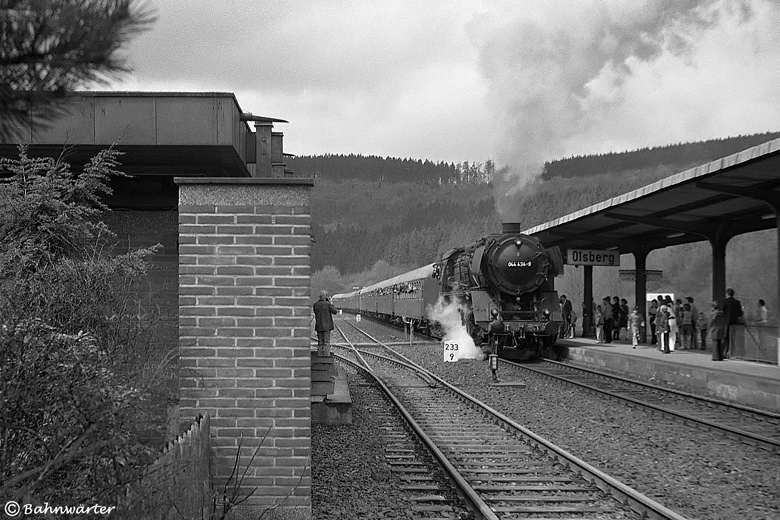 Km 233,887 Bahnhof Olsberg [EOLS]Bei der DGEG-Sonderfahrt "Mit Dampf durchs Sauerland" nach Brilon Stadt am 08. Mai 1977 war auch der Bahnwärter mit der Kamera dabei. In Olsberg konnte er die Einfahrt mit Zuglok 044 434 auf seinem schwarz ⁄ weiß-Film bildlich festhalten. Hier das entsprechende Ergebnis: