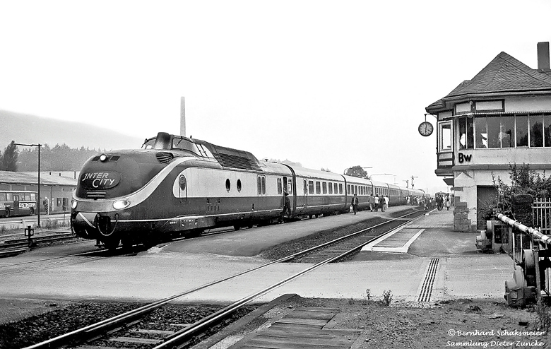Km 227,000 Bahnhof Bestwig [EBWG]Planmäßig fuhren sie hier nie, die eleganten Dieseltriebwagen der Baureihe 601. So muss es sich beim gezeigten Bild wohl auch um einen Sonderzug gehandelt haben, den Bernhard Schaksmeier beim Zwischenstopp am Bahnsteig mit Stellwerk "Bw" aufgenommen hat. Wegen dem noch vorhandenen Intercity-Schild ist das Bild vermutlich im Jahr 1979 entstanden.