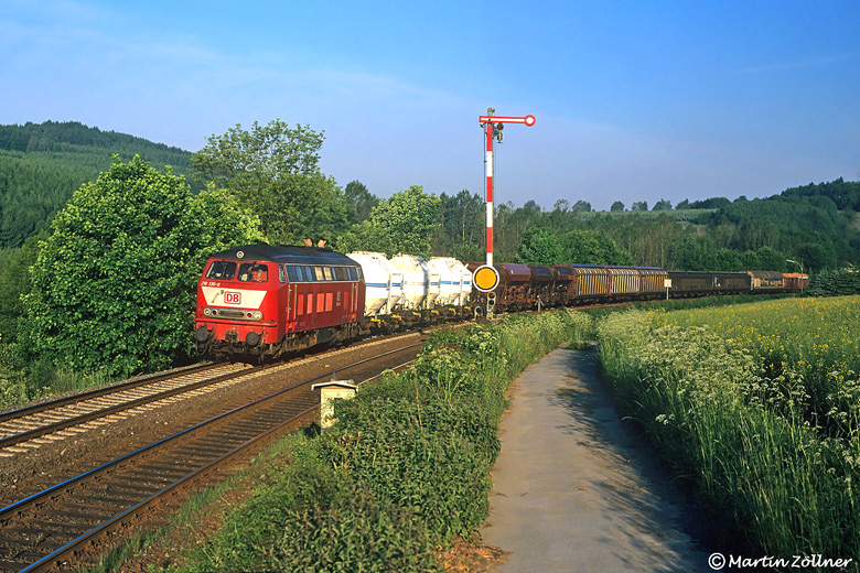 Ende der neunziger Jahre konnte man noch die BR 218 vor den DB Cargo-Güterzügen im Oberen Ruhrtal erleben. Die Steigungsrampe Bestwig – Brilon Wald durften die Maschinen im Langsamgang mit maximal 850 Tonnen Anhängelast befahren. Voll ausgelastet schleicht 218 136 am Morgen des 05. Juni 1997 am Nuttlarer Dümel bergan und passiert dabei das für die Gegenrichtung gültige Blocksignal D der Blockstelle Nuttlar Ost. Das ebenfalls hier vorhandene Vorsignal kündigt bereits die Stellung des Hauptsignals an der Abzweigstelle Nuttlar an.