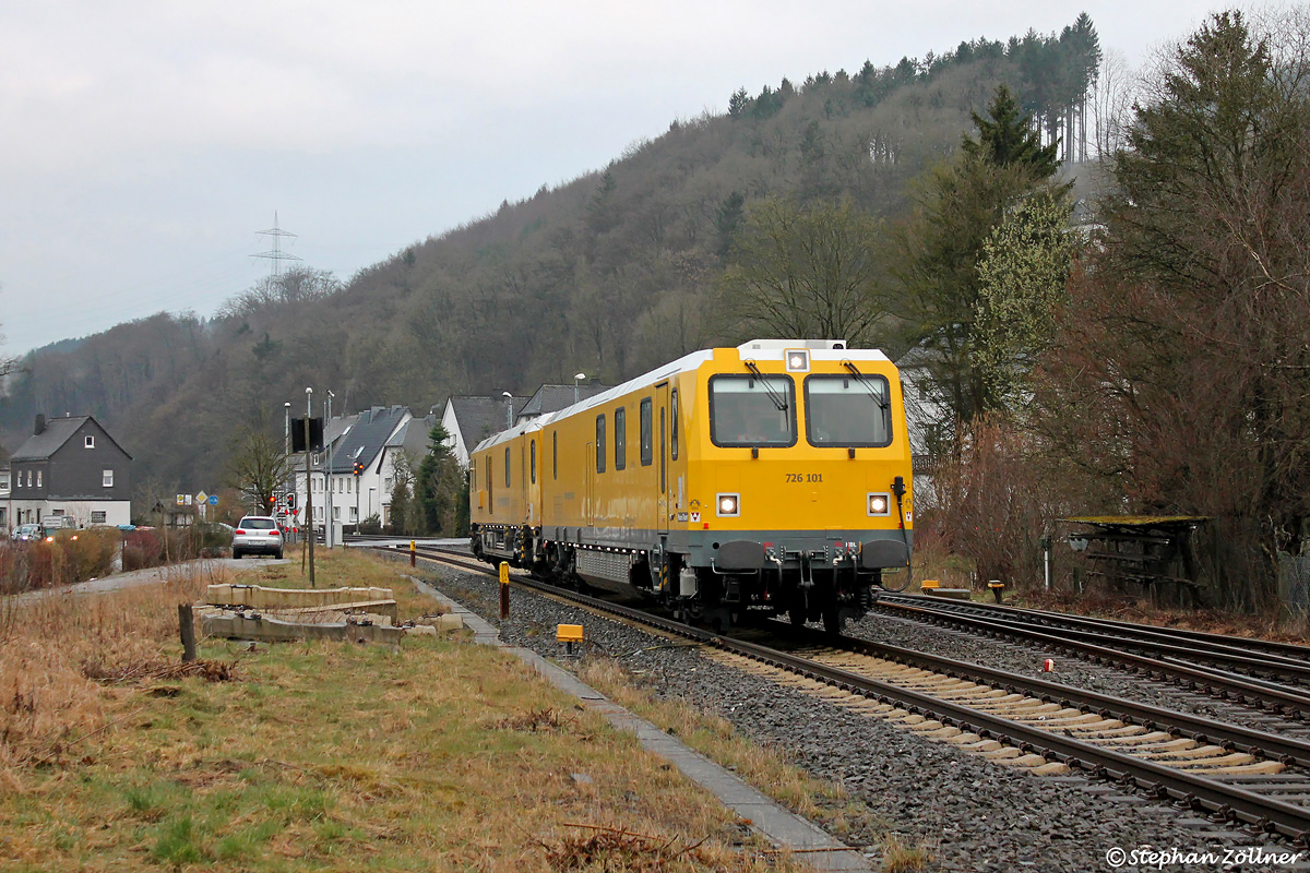 Am 02. März 2010 gegen zwanzig vor Zwei erreichte den Fotografen ein Anruf, dass im Abstand zum RE 29519 nach Winterberg ein Messzug gen Kassel unterwegs sei. Also fix die Kamera geschnappt und an der "schnell mal hin" Fotostelle am heimischen Nuttlarer Bahnübergang postiert. Tatsächlich erschien dann wie gemeldet bei bescheidenen Wetterverhältnissen der Lichtraumprofilmesswagen 719 045 ⁄ 046 auf der Bildfläche (Bild links). Auf dem Weg zum Bäcker konnte dort am 01. April 2016 die Gleismessfahrt von Hagen Hbf nach Brilon Wald mit 726 ⁄ 725 101 mitgenommen werden. Das Zeiteisen zeigte exakt 08.03 Uhr als der Verschluss ausgelöst wurde (Bild rechts).