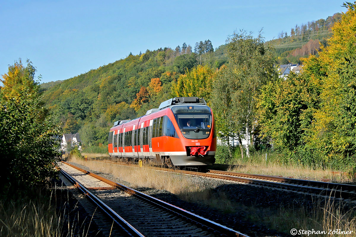 Km 229,150 Nuttlar BahnhofAbsolutes Bilderbuchherbstwetter gab es am Sonntag, den 09. Oktober 2022. Das sollte bildlich für die Leerzuführung zum Säuferzug 10792 nach Willingen genutzt werden. Die kam um zehn nach elf in Nuttlar richtig im Licht nur mit einem Talent daher (Plan = 3x 644), womit es mitten in der Saison später beim Vollzug aus dem Upland wohl eher etwas kuscheliger im Fahrgastraum zuging (Bild links).