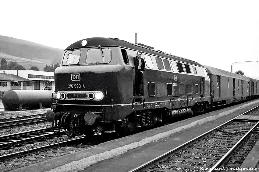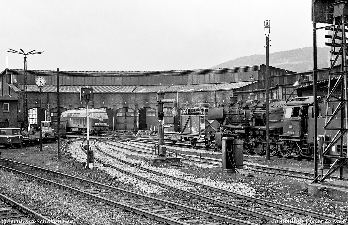 Km 227,200 Bw Bestwig [EBWG 1]Der kurze Wochenend-Mittagsblick ins Bw Bestwig irgendwann in 1972 um kurz vor halb Eins: Die Hagener 218 157 fährt gerade von der Drehscheibe in den Schuppen, während 051 751 vom Bw Duisburg-Wedau draußen am Bockkran geparkt ist. Ansonsten sind keine weiteren Aktivitäten festzustellen.
