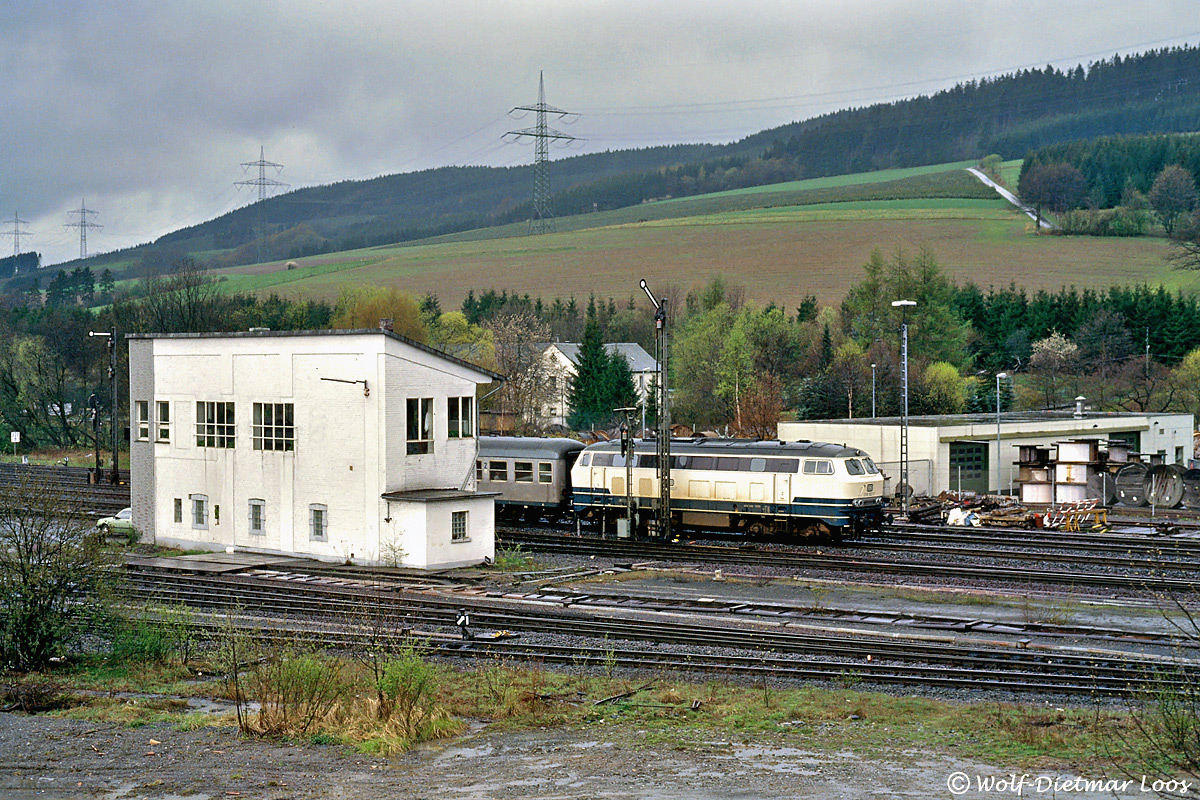 Im Winterfahrplan 1990 ⁄ 91 fuhr zwischen Warburg und Bestwig am Nachmittag das Nahverkehrszugpaar N 6084 ⁄ 6087, welches aus drei Schnellzugwagen gebildet war. Am dunstigen 07. März 1991 hat die Kasseler 216 221 mit dem N 6084 den Halt in Olsberg hinter sich gelassen und passiert das ehemalige, westliche Stellwerk sowie das damals noch vorhandene Ausziehgleis.